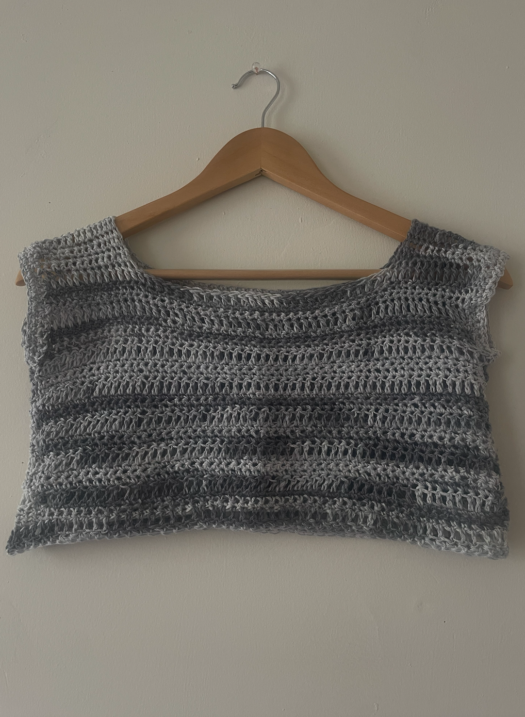 1 of 1 blue and white blended crocheted crop top fits xs to medium best, measuring a 32" bust. the material can stretch an additional 2"